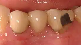 Before: 3 Unit bridge with chipped porcelain molar (supporting metal showing on molar tooth), poor enamel color match to patient's natural teeth, and poor fit around the patient's gumline. After: Replaced Bridge with an All Porcelain Bridge. The new bridge now also matches the patient's natural tooth color and was designed to properly fit around the gumline. Proper fit aids in decreasing decay and the ease of the patient's ability to clean around a bridge.